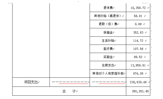 3、社会保障和就业支出共计10,789.99万元,占总支出的3.08%。主要用于行政及事业单位离退休费支出。