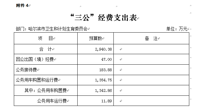 2015年度“三公”经费支出合计2,940.38万元,占年度部门预算支出的0.84%,其中:因公出国(境)经费支出47万元;公务接待费支出183.88万元;公务用车运行维护费支出1,354.75万元。变化原因为:“三公”经费预算数是按照在职人员工资数自动生成,由于卫生和计生两部门合并,以及2015年在职人员人数较2014年增加,因此2015年“三公”经费预算数较2014年有所增长。